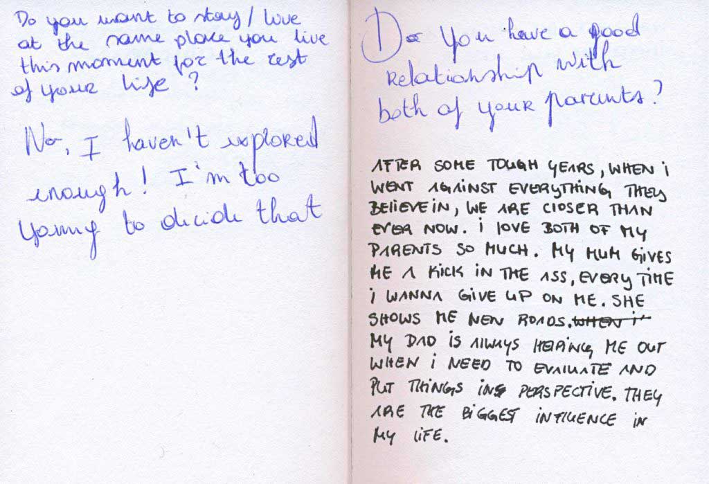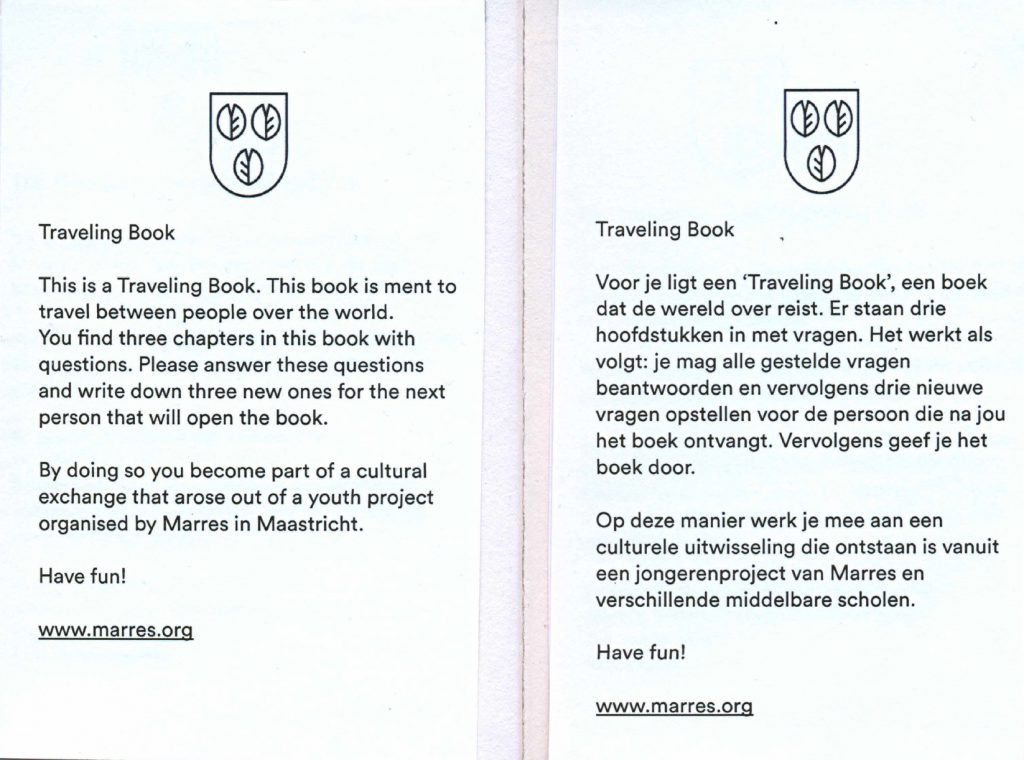 Onder begeleiding van de Hongaars kunstenares Zsófia Szemző bedachten zij zogenaamde Traveling Books, rondreizende boekjes waar anoniem vragen in staan. Wanneer een Traveling Book op je pad komt, mag je de vraag beantwoorden en vervolgens een nieuwe stellen. Daarna geef je het boekje door aan iemand anders.
