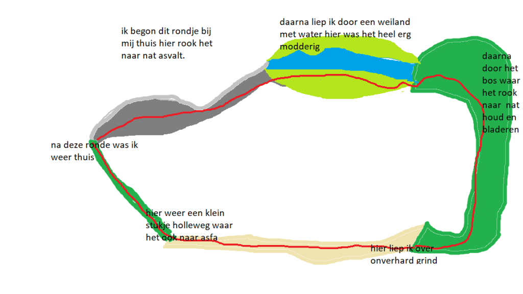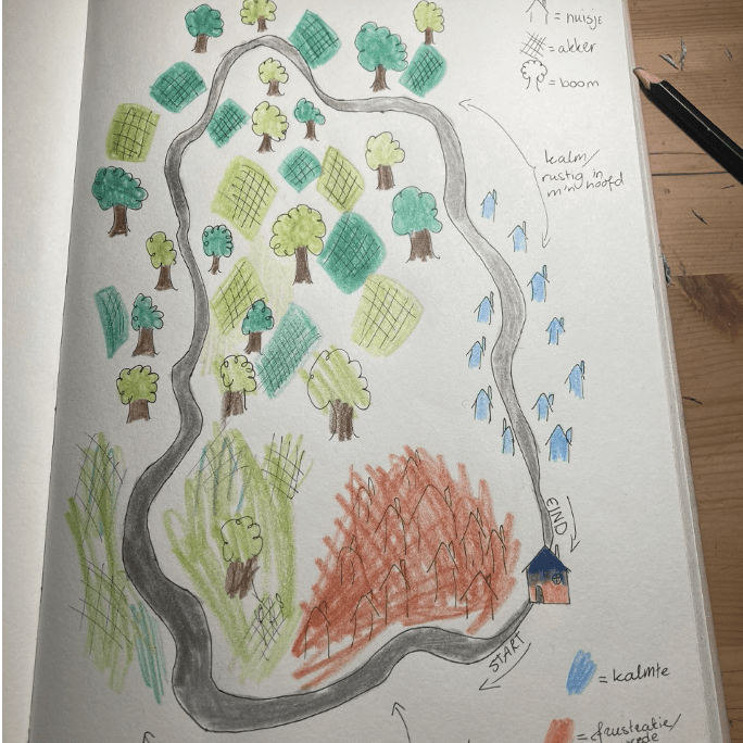 De huiswerkopdracht luidt daarom ‘maak een Sensory Map van een zelfgekozen route in je omgeving’. De leerlingen worden naar buiten gestuurd om hun zintuigen in kaart te brengen door woorden, geluid en symbolen te koppelen aan hun waarneming. Het is prachtig om te zien dat alle leerlingen de routekaart op hun eigen manier vormgeven. Met deze opdracht zijn ze uitgedaagd om opnieuw naar hun omgeving te kijken, ruiken en horen. Misschien hebben ze zelfs de lucht geproefd.