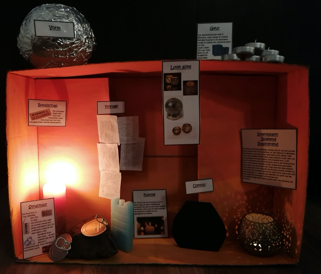In een vervolgopdracht zoeken de leerlingen een object die ze zintuiglijk in kaart gaan brengen. Dit kan op verschillende manieren, bijvoorbeeld door het uitvoeren van materiaalonderzoek of het maken van frottages. Maar ook door zich voor te stellen welke smaak of welk gerecht bij het object zou passen. Kortom; een gekozen object analyseren vanuit alle zintuigen, om hier vervolgens verbeter- of verander punten aan voor te stellen. Deze verander punten werken de leerlingen uit in een 2D of 3D werkstuk.