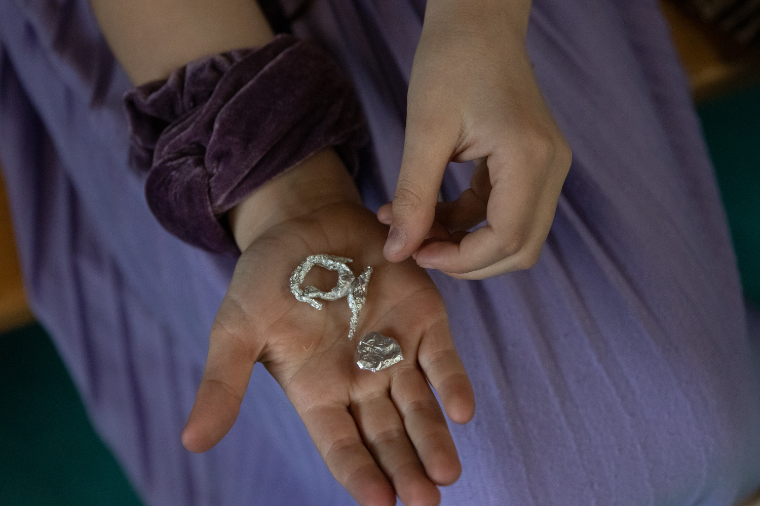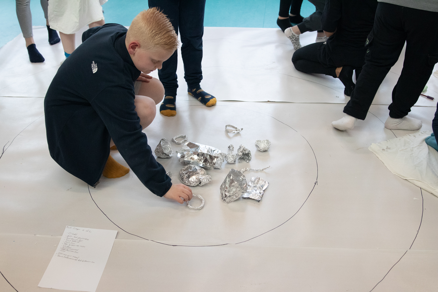 Na het luisteren delen de leerlingen met elkaar wat ze hebben gehoord. Gezamenlijk reconstrueren we het verhaal . Daarna gaan de leerlingen de kunstschatten die worden omschreven vormgeven met aluminium folie en stof. Alle gemaakte objecten komen daarna weer in de cirkel terug. De cirkel is het midden van de les. Iedereen wordt hierin gezien en is gelijkwaardig aanwezig.