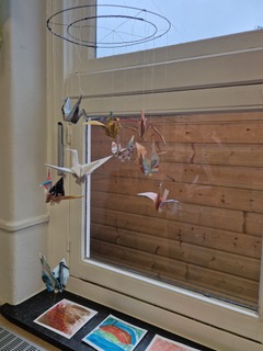 Het is vrijdagochtend en in de projectruimte van MIK klinkt pianomuziek. Er vliegen 10 vrolijk beschilderde gevouwen kraanvogels door het lokaal, zorgvuldig vastgehouden door kleuterhanden. De ene vliegt van tak naar tak, de ander hoog door de lucht, de ander laag, de een snel, de ander langzaam. Als de vogels elkaar tegenkomen, begroeten ze elkaar.