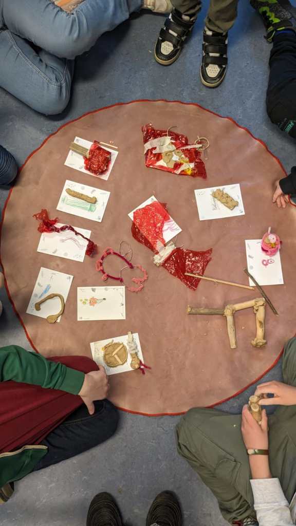 De studenten reflecteren tijdens een evaluatiemoment over het maakproces, hun eigen ontwerp en de connectie van duurzaamheid en design.