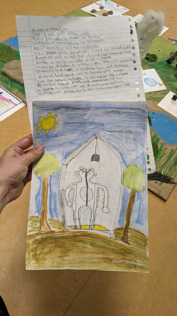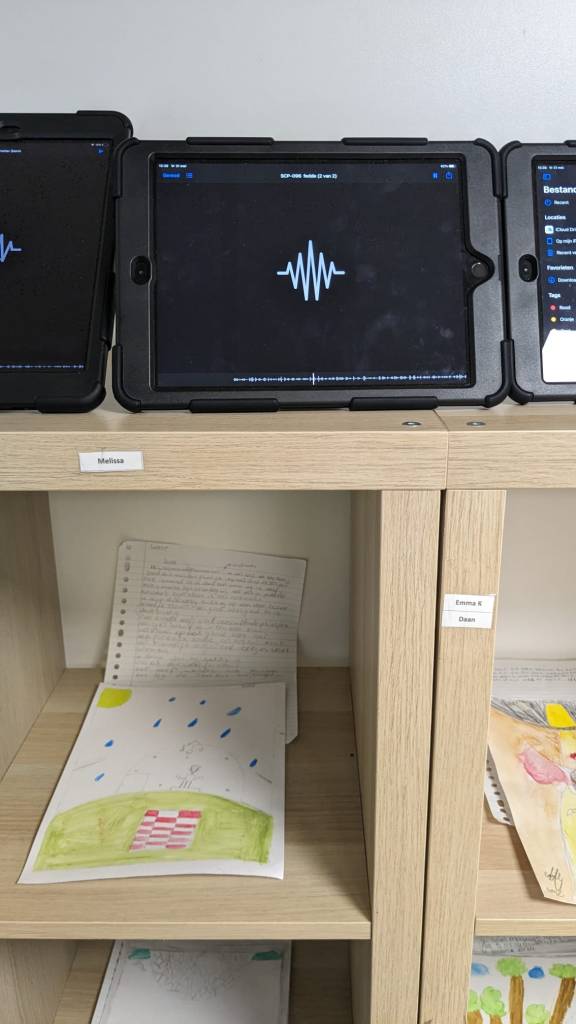 Op de derde workshop maken ze een eigen verhaal over hun kunstwerk, dit spreken ze daarna ook zelf in. Bij het beschrijven van het kunstwerk betrekken ze alle zintuigen.