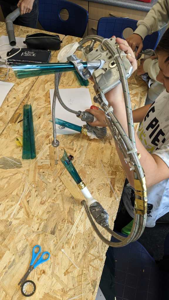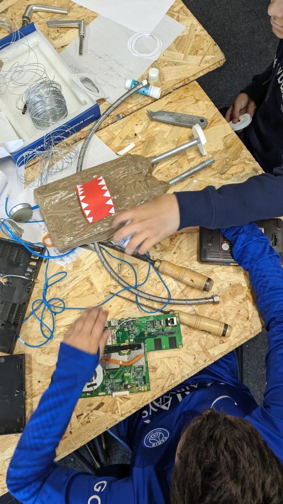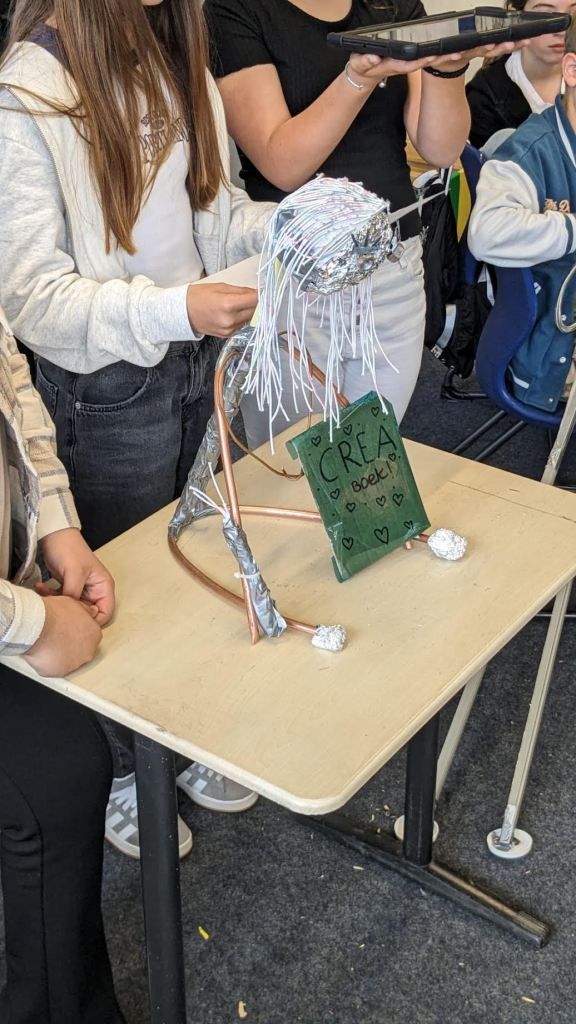 Ze gaan aan de slag met allerhande gerecycleerde elektro toestellen en industriële materialen zoals koperen buizen, schroeven, oude tablets, ijzerdraad, microships, afvourslangen,… Ze leren verschillende demonteer en hechtingstechnieken met behulp van schroevendraaiers, handboor en handzaag, colsonbandjes, ducttape,.. Experiment en het ontdekken van de onconventionele materialen staat hierbij centraal.