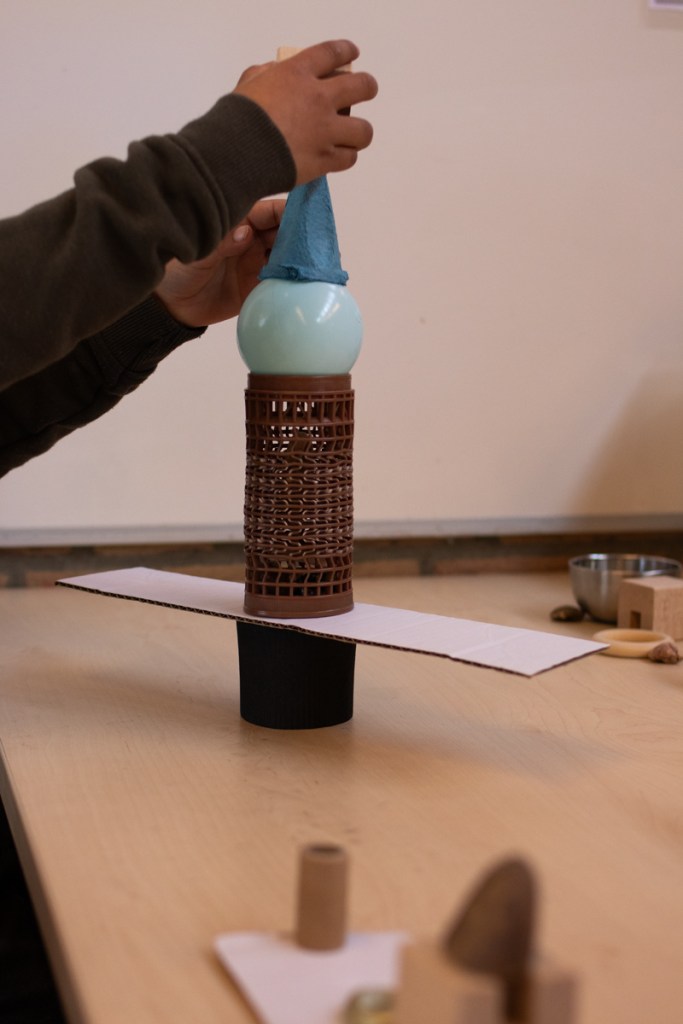 De tweede les stond in het teken van zintuigelijke ontdekking en objectanalyse. We begonnen de les met een korte bewegingsoefening waar de leerlingen moesten reageren op vragen als: is het gebruikelijk om bij jou thuis de schoenen uit te doen? Hoeveel broers en zussen heb je? Vervolgens werd de klas in tweeën verdeeld en begon het zintuigelijk materiaalonderzoek. Er lagen steeds andere materialen onder een kleedje en de leerlingen mochten enkel voelen en aan de rest van de groep beschrijven wat ze ervaarden. Daarnaast moesten ze ook nadenken waar ze het materiaal in de klas terug konden vinden. We sloten de les af met een gesprek over de objecten die de leerlingen van thuis hadden meegenomen.