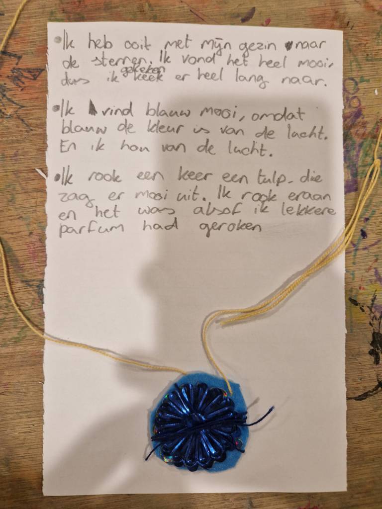 De laatste twee lessen bestonden uit het maken van een persoonlijk amulet. Om de leerlingen op gang te helpen begonnen we met een groepsgesprek rondom de vragen: wanneer ben je het meest jezelf? Hoe zou je jezelf omschrijven aan iemand die je niet kent? Wat zijn belangrijke ervaringen voor jou? Wat doe je graag in je vrije tijd? Welke mensen zijn belangrijk voor jou? Met deze vragen in gedachten begonnen de leerlingen aan het ontwerp van hun amulet. Ze gebruikten de inzichten uit het gesprek om verschillende symbolen en materialen te kiezen die hun identiteit vertegenwoordigen. Stof, karton, lint, touw, stiften, naald en draad, bedeltjes, van alles werd gebruikt om de amuletten in elkaar te zetten. De leerlingen hebben prachtige amuletten gemaakt en in de reflectie van hun amulet kwamen zeer inspirerende verhalen naar boven. Zo had een leerling een ster verwerkt in zijn amulet omdat dat het hem deed denken aan een moment dat hij met zijn familie naar de sterren had gekeken. Het was erg mooi om te horen hoe de leerlingen zo open vertelden over hun ervaringen en de amuletten waren prachtig.