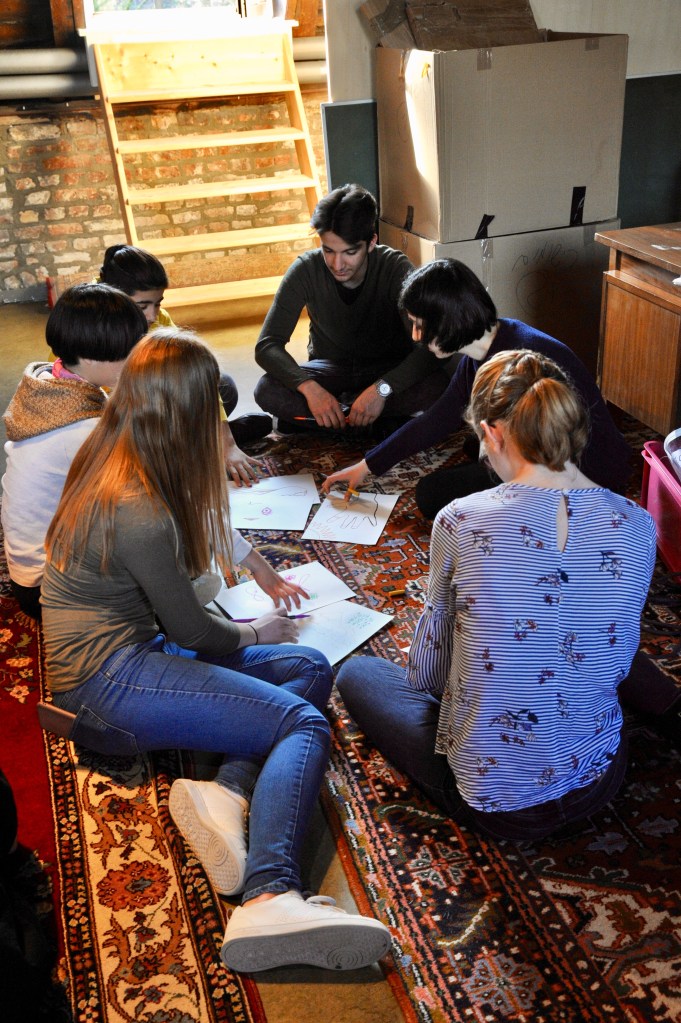 Ieder een eigen kleur stift, na een minuut de tekening doorgeven en verder werken aan wat er al is. Zo ontstaat langzaam een kleurig geheel uit unieke delen.